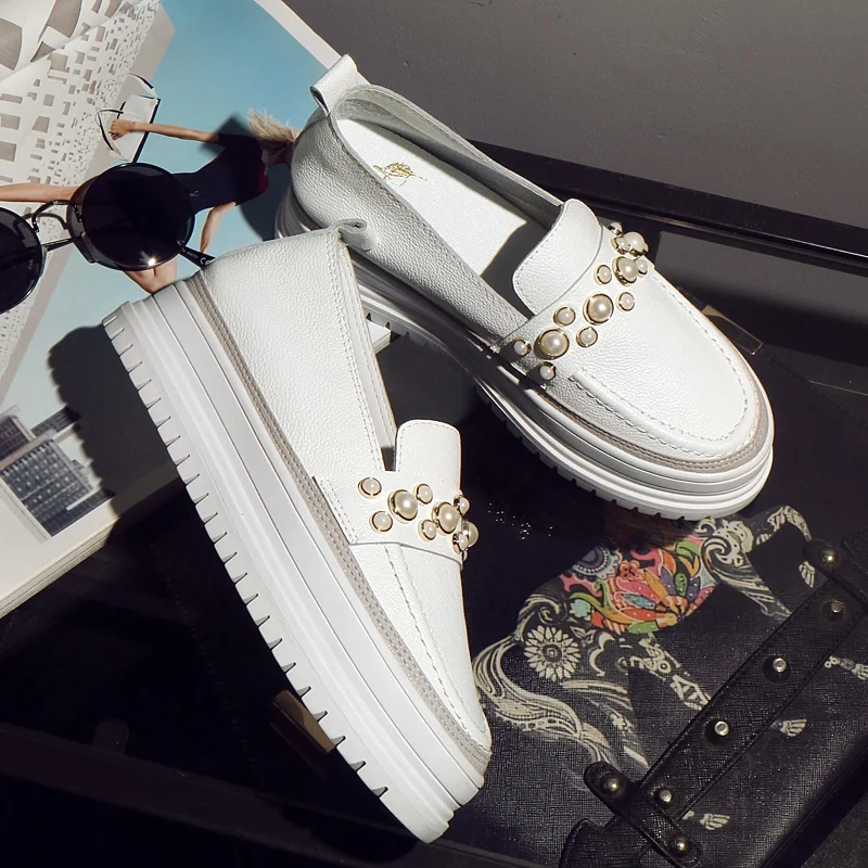 أرغب في شراءمعلومات اضافية جلد طبيعي أحذية بيضاء صغيرة اثنين من نمط شرابة القوس التعادل جلد قماش أحذية النساء اللؤلؤ رصع الأخفاف المتسكعون
